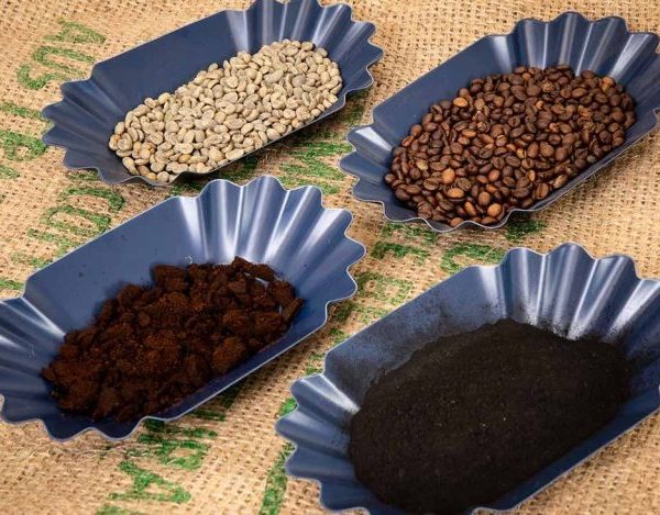 Uzorci nepržene kafe u zrnu, pržene kafe u zrnu, iskorišćene mlevene kafe i biouglja od kafe koji je stvorio istraživački tim; Foto: Carelle Mulawa-Richards, RMIT University